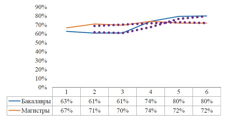 Анализ результатов позволяет сделать вывод об устойчивой положительной динамике показателя активности после внедрения коучингового подхода в образовательный процесс. Рост составил 20 % и более, т.е. количество вовлеченных в усвоение материала студентов выросло с 20 % до 50 %, и та же картина наблюдается у студентов магистратуры (Рис. 4).
