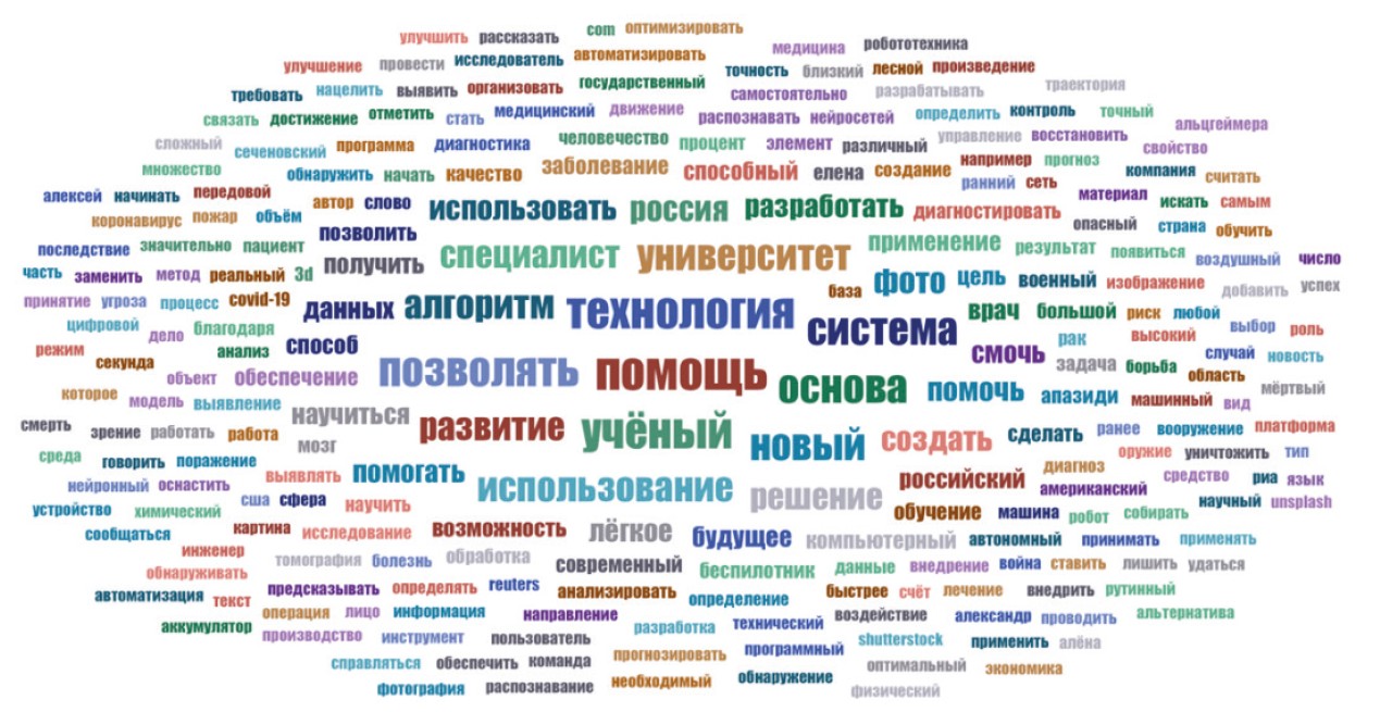 Рассмотрение дискурса об ИИ целесообразно начать с позиции акторов, которые наиболее часто упоминаются в публикациях и формируют образ ИИ в СМИ, — это эксперты. В рамках данной категории было представлено 283 фрагмента текста, из которых 83 % имели положительную тональность, а 17 % — отрицательную. Облако слов, наиболее часто употребляемых в высказываниях экспертов, представлено на рисунке 2, и большинство из встречающихся в них понятий имеют позитивную коннотацию: «помочь», «позволять», «разработать», «решение» и др. В статьях также встречается синоним ИИ — «технология». С помощью программы Atlas.ti были выявлены прилагательные, используемые вместе с данным словом: «продвинутая», «передовая», «современная», «решающая», «военная».