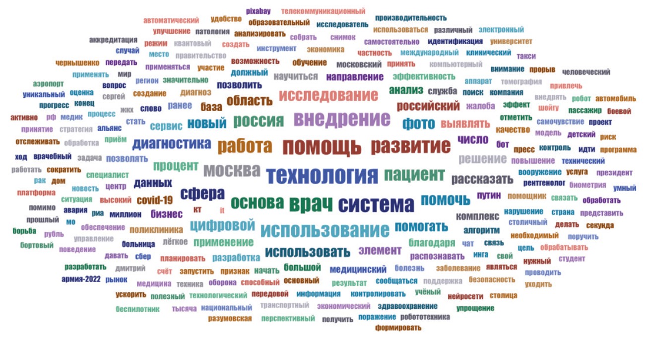 Позиции бизнеса также схожи с уже упомянутыми. Количество фрагментов текста, в которых актор затрагивает тему ИИ, — 195, и это почти исключительно положительные оценки (98 %). Облако слов, наиболее часто встречающихся в высказываниях представителей бизнеса, представлено на рисунке 4: доминируют опять «помощь», «технология», «решение», «развитие», технологии характеризуются как «новые», «продвинутые», «передовые», «высокие».