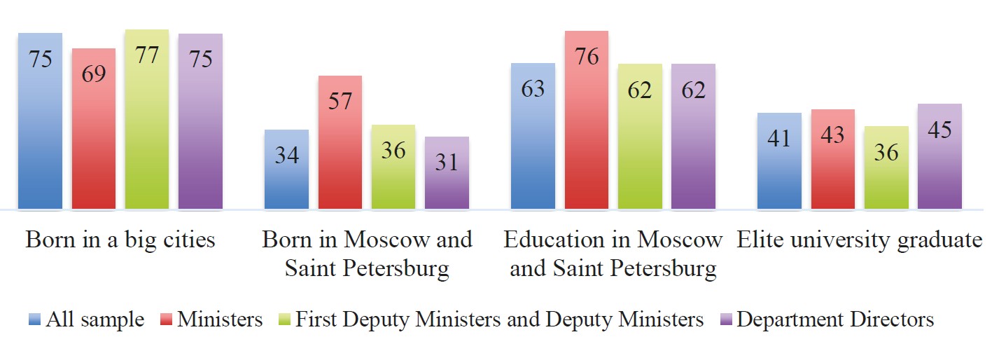 To test H.1, we conducted a descriptive analysis of higher bureaucrats’ social-demographic characteristics. We considered this group as social elite primarily by the birthplace (large cities with better education opportunities) and the university rank.