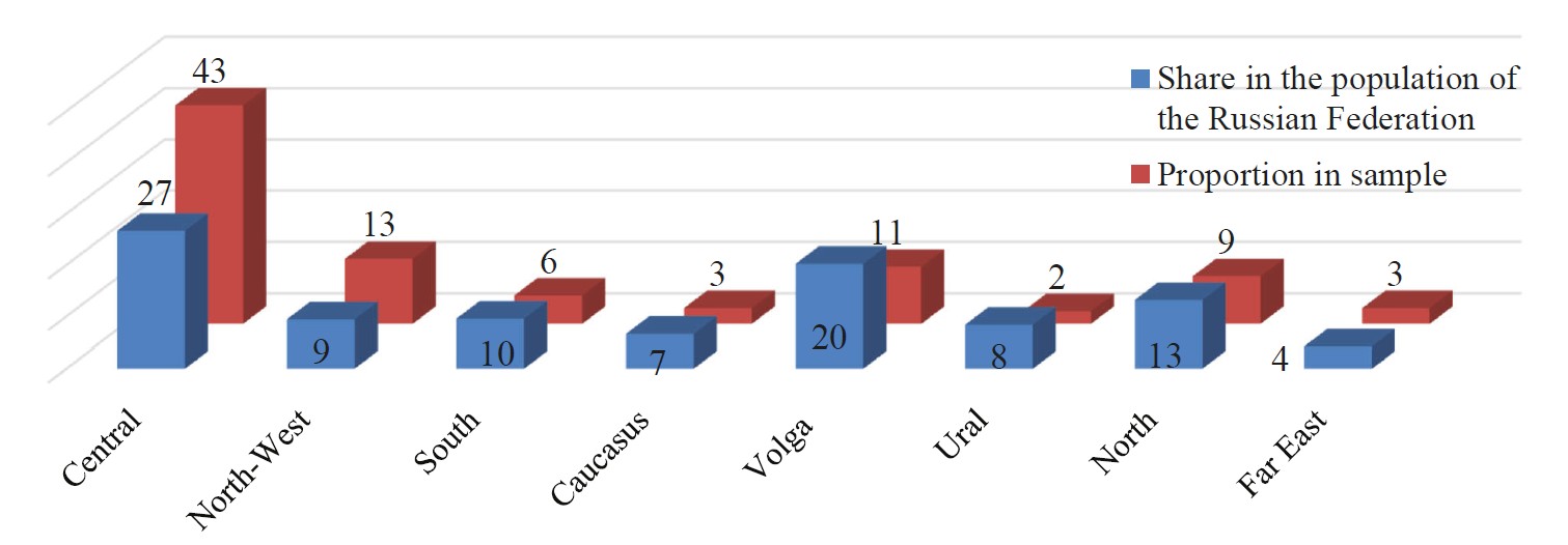 Figure 1. supports H.1, since most higher bureaucrats (76 %) were born in large cities. Distribution by region with the share of regions in the Russian population is shown in Figure 2. The largest groups of senior officials are from the Central (43 %) and Northwestern (13 %) regions, which significantly exceeds the share of these regions in the country’s population. Since the largest cities — Moscow and Saint Petersburg — are in these regions, their natives have disproportionately high opportunities for a career. 62 % graduated from Moscow and Saint Petersburg universities, 41 % — from the highest rank universities such as Moscow State University, Moscow State Institute of International Affairs, Russian Presidential Academy of National Economy and Public Administration, Saint Petersburg State University, Higher School of Economics and Financial University under the Government of the Russian Federation. 30 % have liberal arts diplomas, 24 % are economists or managers, 12 % have degrees in engineering, less than 9 % began a military career, and 8 % have degrees in natural sciences. About 5 % have more than one college degree, 33 % have university diplomas in two or more majors. 1 % studied abroad. Almost 34 % have academic degrees of candidate or doctor of sciences, and 48 % received state awards. These indicators are significantly higher than the average for civil servants