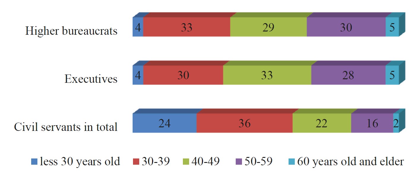 In Figure 3, there are approximately equal shares of the top bureaucrats aged 30–39, 40–49, and 50–59. There is no significant age increase in relation to the position: the share of 30–39-year-olds among senior bureaucrats is even higher than among line managers.