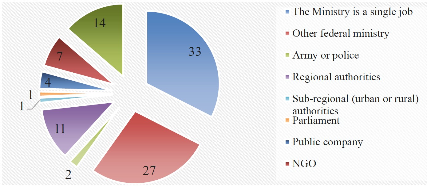 Higher bureaucrats’ previous jobs are presented in Figure 5: every third did not work anywhere else except the ministry, 27 % came from another federal ministry. Transfers from army or police are not common, rather there are transfers from regional authorities (11 %) or business (14 %) to the federal government.