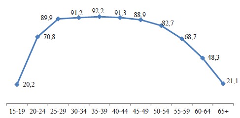 Каковы же механизмы использования преимуществ демографического дивиденда: использование избыточной рабочей силы [21] и инвестиции [23]. В первом случае речь идет о неизбежном выходе поколения бэби-бума на рынок труда, что создает «демографическое окно возможностей», снижает коэффициент демографической нагрузки детьми и увеличивает выпуск продукции на душу населения (конечно, при условии, что рынок труда может поглотить все возрастающее количество работников). Так, в период «золотой структуры» населения (2022 год) во Вьетнаме доля трудоспособного населения в структуре поколений 25–59 лет достигла 87 %, 35–39 лет — 92,2 %, 40–44 лет — 91,3 %, 30–34 лет — 91,2 % (среди 15–19-летних и тех, что старше 65 лет, — около 20 %) (рисунок 1).