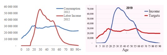 Очевидно, что изменения в возрастной структуре населения могут оказать существенное влияние на экономический рост, однако общепринятые подходы, как правило, показывают лишь общую тенденцию, но не особенности влияния возрастной структуры на экономику. Поэтому в последние годы все чаще применяется концепция жизненного цикла [20]: для оценки вклада возрастной структуры в экономическое развитие используется такой инструмент экономико-демографического анализа, как национальные трансфертные счета (далее — НТС). Во Вьетнаме его применение показало, что период (денежного) накопления короче период экономической активности (15–64 года) и демонстрирует постоянные колебания: например, в 2012 году период накопления в жизненном цикле (когда доходы превышают потребительские расходы) составлял 23–53 года [48], а к 2019 году расширился и составил 22–56 лет [16] (рисунок 2).