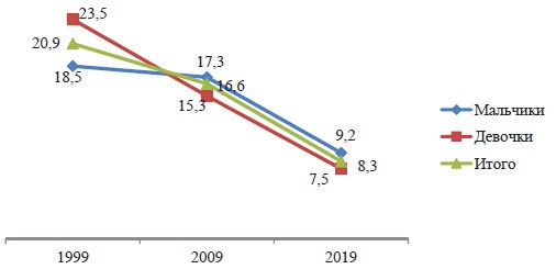 Рис. 3. Доля детей, не посещающих школу, 1999–2019, в %