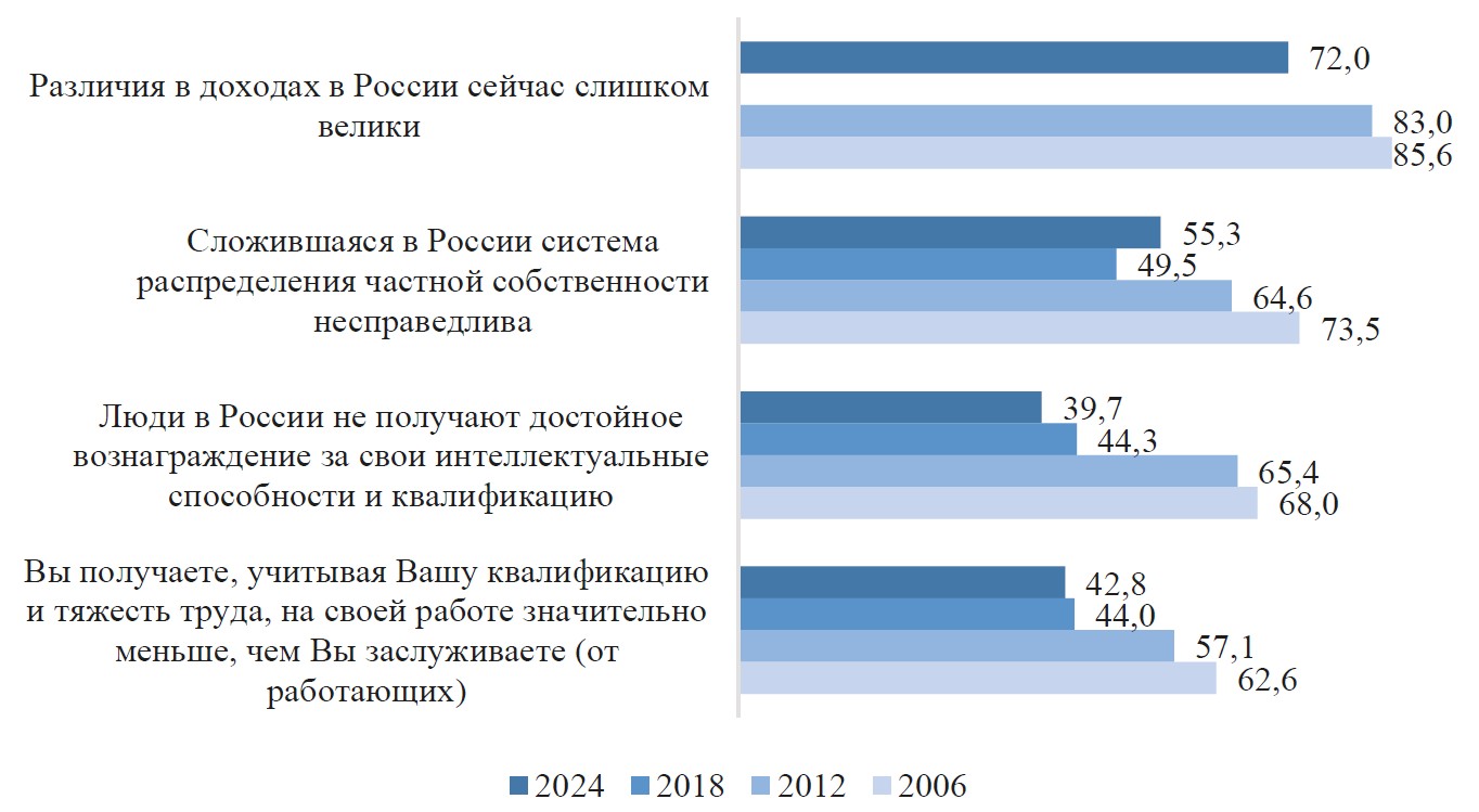 Эти показатели согласуются и с данными о том, что на нормативном уровне россияне предпочли бы жить в обществе, где приоритет — обеспечение равенства возможностей. Так, выбирая между равенством возможностей и равенством доходов, 58,2 % склоняются к первому варианту, 40 % — ко второму, а остальные затрудняются с ответом. Такое распределение подчеркивает, с одной стороны, достаточно высокое и постепенно растущее значение доходного неравенства в глазах населения (три десятилетия назад сторонники равенства доходов составляли 25 % населения, в 2010-е годы эта доля возросла и стабилизировалась на уровне 40 %), с другой — понимание важности, даже более высокой, немонетарных измерений неравенства, определяющих неравные возможности социальных групп, что и отражается в оценке их болезненности.
