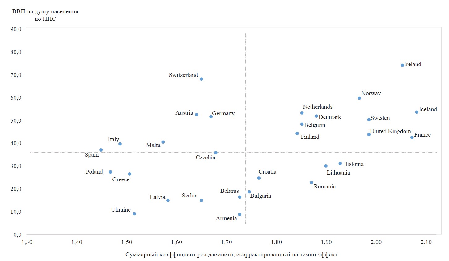 Рис. 1. Распределение стран Европы по показателям суммарного коэффициента рождаемости и ВВП на душу населения относительно среднего уровня по всем странам