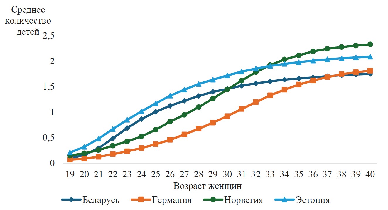 Проследить динамику деторождения и оценить возрастные различия в реализации репродуктивных установок можно на основе накопленного уровня рождаемости в течение репродуктивного периода: верхняя граница активного репродуктивного возраста практически одинакова для всех стран — около 33–35 лет, для стран с более развитой экономикой — 36–37 лет, т.е. решение о деторождении в верхних границах интервала значительно снижает шансы последующих рождений (рисунок 2).