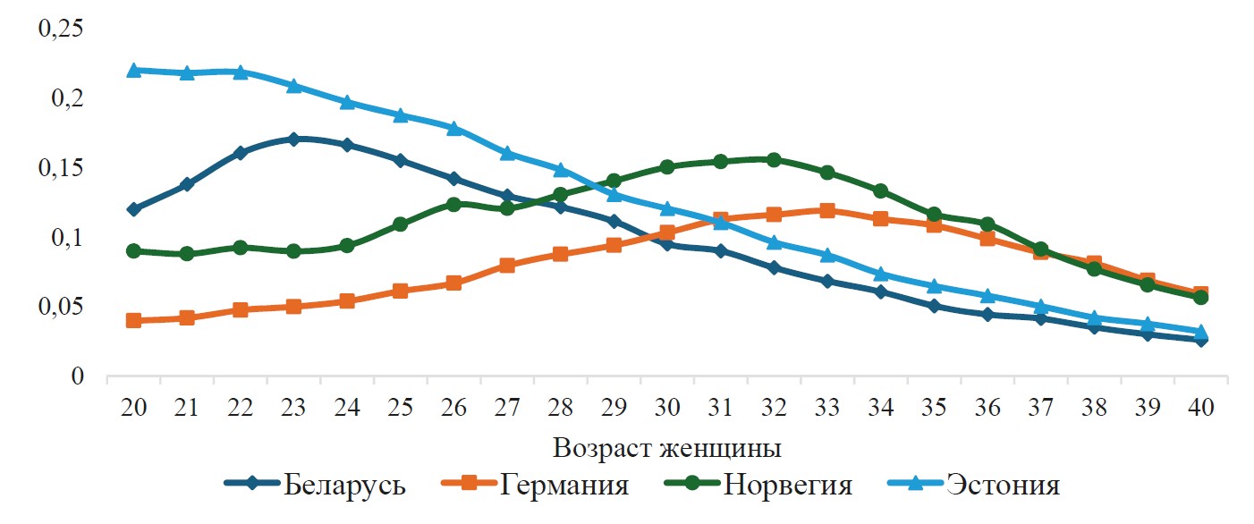 Для стран, характеризующихся относительно низким уровнем ВВП на душу населения, основной прирост рождаемости приходится на более ранний возраст — 20–24 года: к этому моменту большинство женщин Беларуси и Эстонии вступили в репродуктивный период и обеспечили более половины общего уровня рождаемости. Для стран первого и второго демографического профиля реализация репродуктивных намерений характерна в более поздних возрастах — 24–31 год, однако, в отличие от предыдущих стран, распределение деторождений в Германии и Норвегии имеет более равномерный характер в течение фертильного возраста, т.е. деторождение, видимо, в меньшей степени зависит от внешних факторов и больше связано с индивидуальными установками (рисунок 3). В частности, Норвегия на протяжении последних десятилетий проводит активную демографическую политику, направленную на поддержку семей с детьми и создание благоприятных условий для рождения и воспитания детей: значительные пособия, включая единовременные выплаты при рождении ребенка и ежемесячные пособия до достижения ребенком 18 лет; меры по защите прав беременных и молодых матерей; гибкий график работы и возможность удаленной занятости позволяют женщине сохранять профессиональную активность, не откладывая рождение детей на более поздние периоды жизни; стимулирование участия отцов в уходе за детьми дает женщинам после рождения ребенка больше возможностей для реализации в профессиональной сфере.